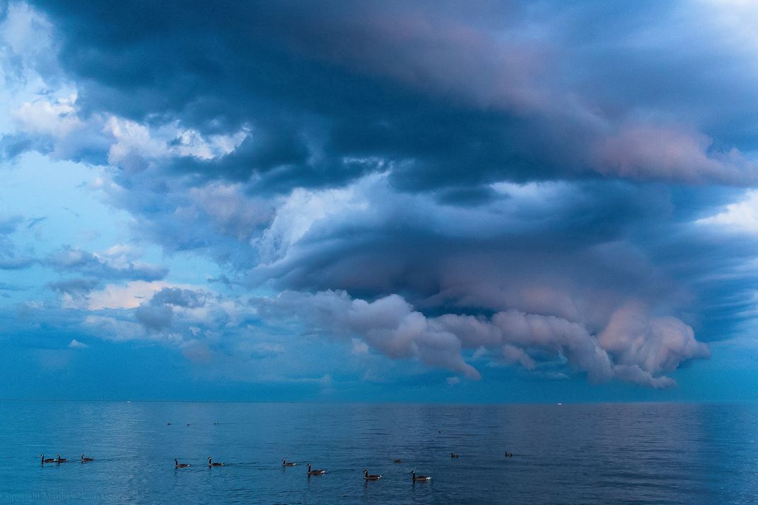 A squall line rolls in over Lake Michigan's shoreline in Milwaukee as Geese calmly move towards a secluded area. These storms are frequent and common, the weather I see in Milwaukee along the Lake in often stunning and dramatic.