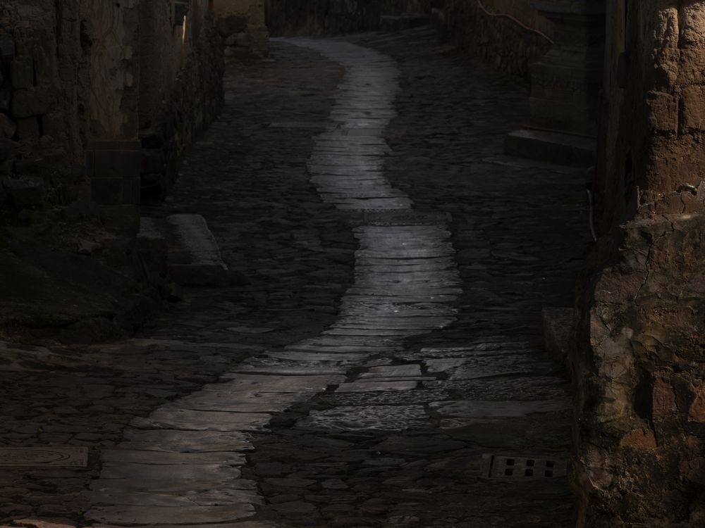 in late afternoon shadow, the foot-smoothed stone patch glitters in a quiet lane lined with mud-houses. the village is older than a century.