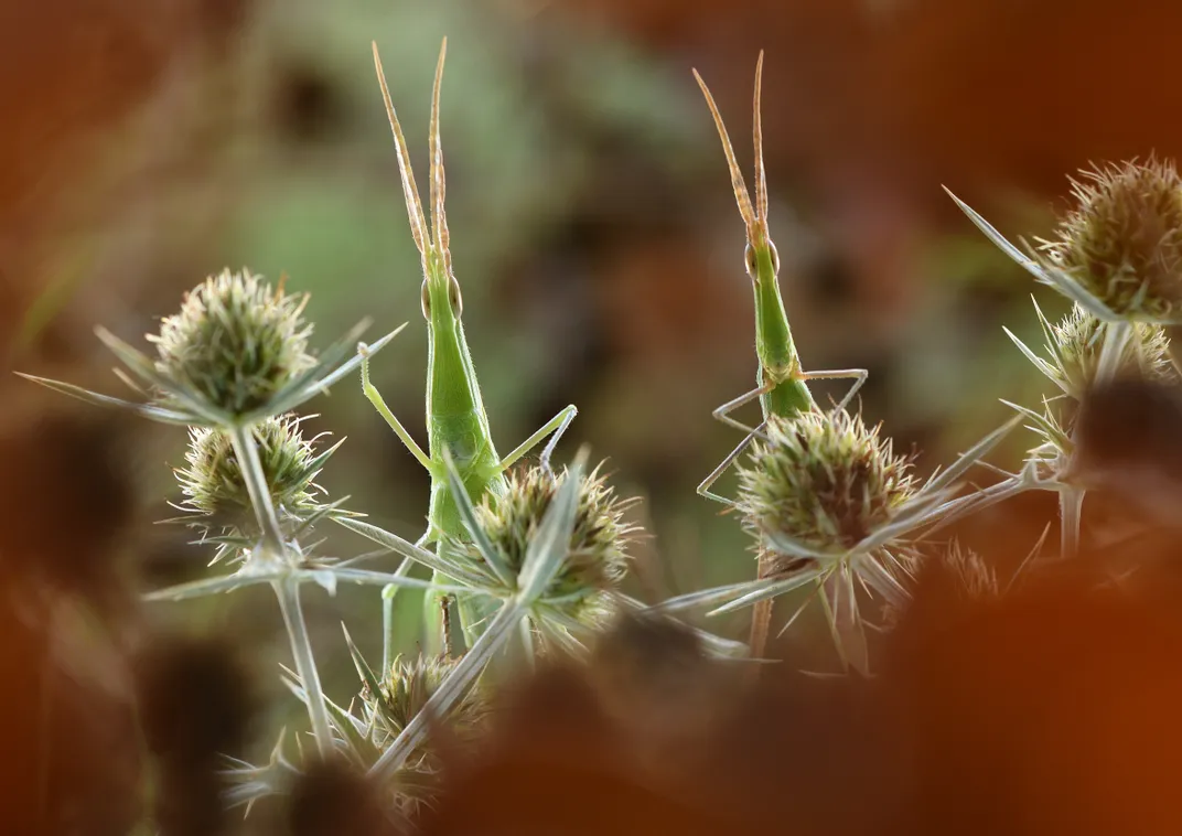 Two grasshoppers of the Acrida ungarica species pose for the camera on a hot summer afternoon.