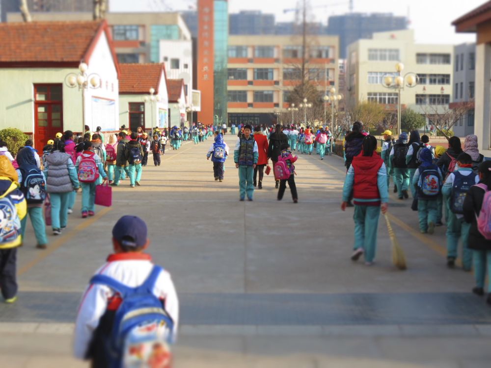 A student aide looks toward the camera at an elementary school in Jiaozhou, China.