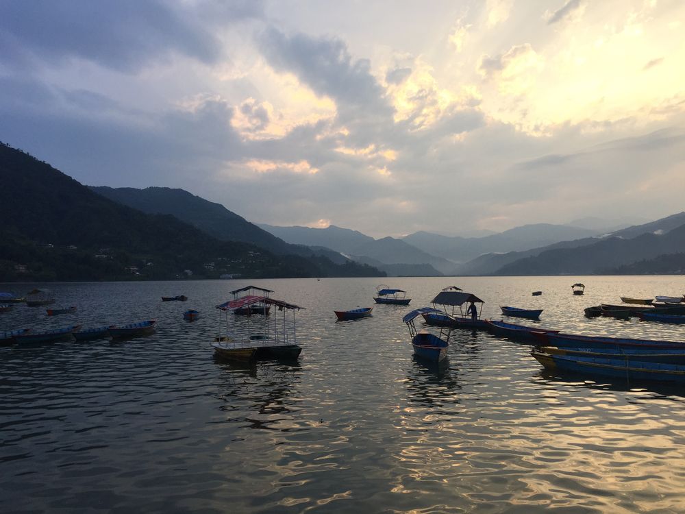 Evening time in the lakeside district in Pokhara, all the boats have been parked for the evening in the shadow of the Himalayan mountains