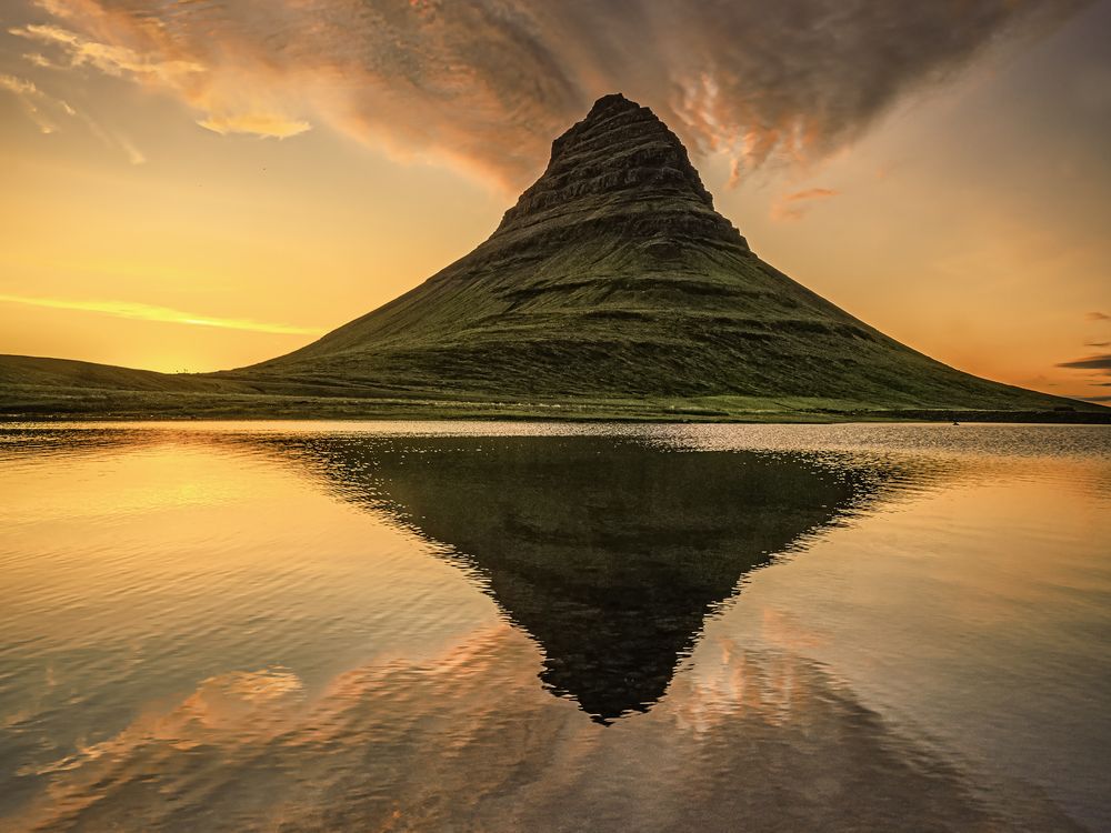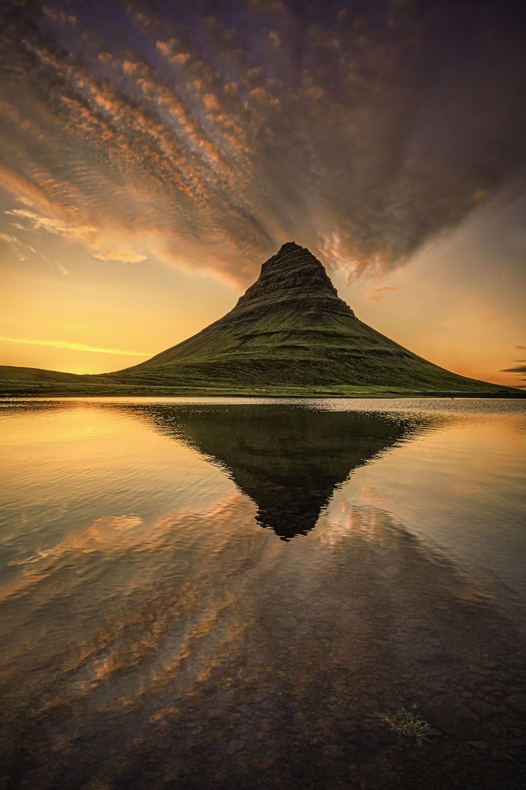Sunset Reflection on Kirkjufell. This image was captured around 11:45 pm during the midnight sun in Iceland last summer. Typically Iceland is very windy and reflections are nearly impossible but luck was in my favor. When I first arrived to the parking lot the sun was just about to set along the horizon. Seeing the crowd of people at the top of the waterfall, I opted to find a different composition. I spotted a small body of water at the base of the waterfall which appeared to be calm. Scrambling down the hill,I managed to find the perfect spot to compose my image.I lowered myself to ground level, set up my shot and watched the sky explode. I studied the clouds as they began to transform into a v shape over the mountain resembling a volcanic eruption. Iceland is known for having consistent volcanic activity so these cloud formations seemed perfect. Volcanos are common in Iceland whereas there are only a few mountains. Kirkjufell mountain is one of the mountains in Iceland which resembles a volcano in shape.She is commonly refered to as the Witches Hat. Quickly as the light was changing, I was able to capture the reflection perfectly before the light was gone and the wind picked up.It was time to wrap it up and head home.