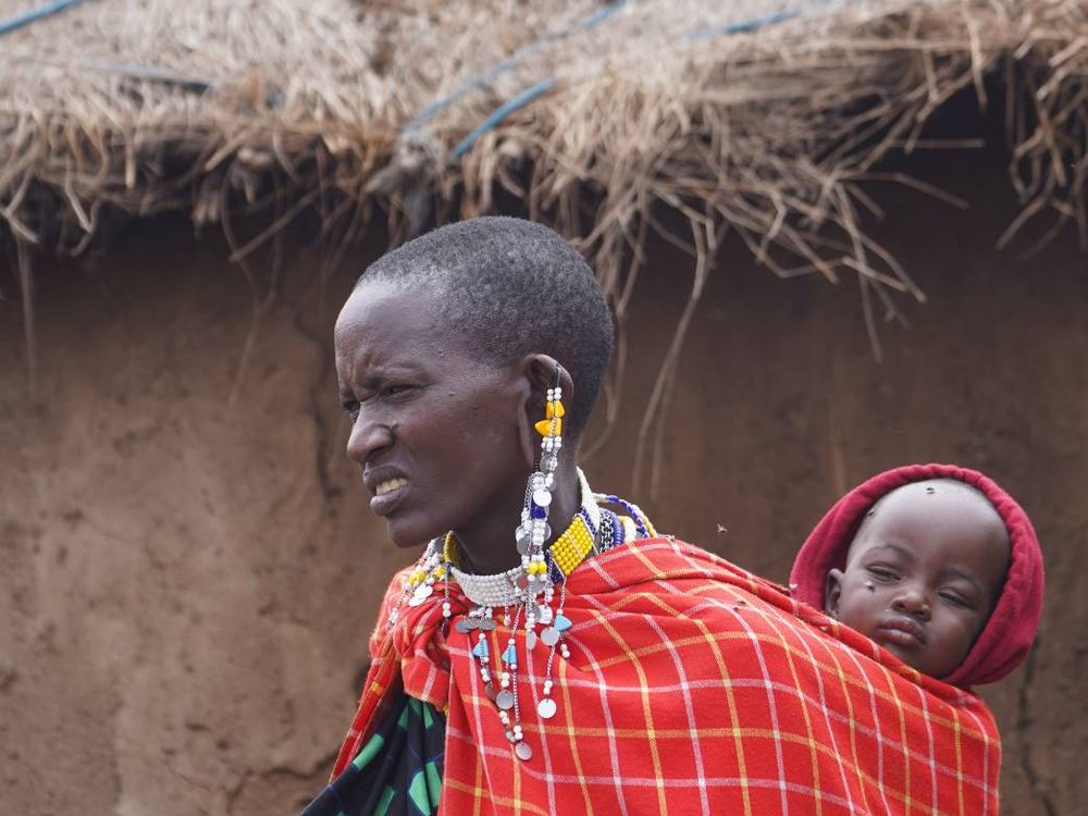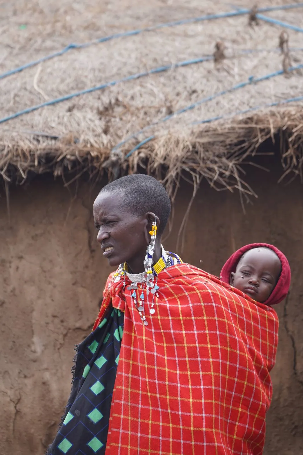A Maasai mother works outside her home with her baby wrapped securely on her back. The child’s calm eyes and the mother’s steady expression reflect resilience passed down through generations.