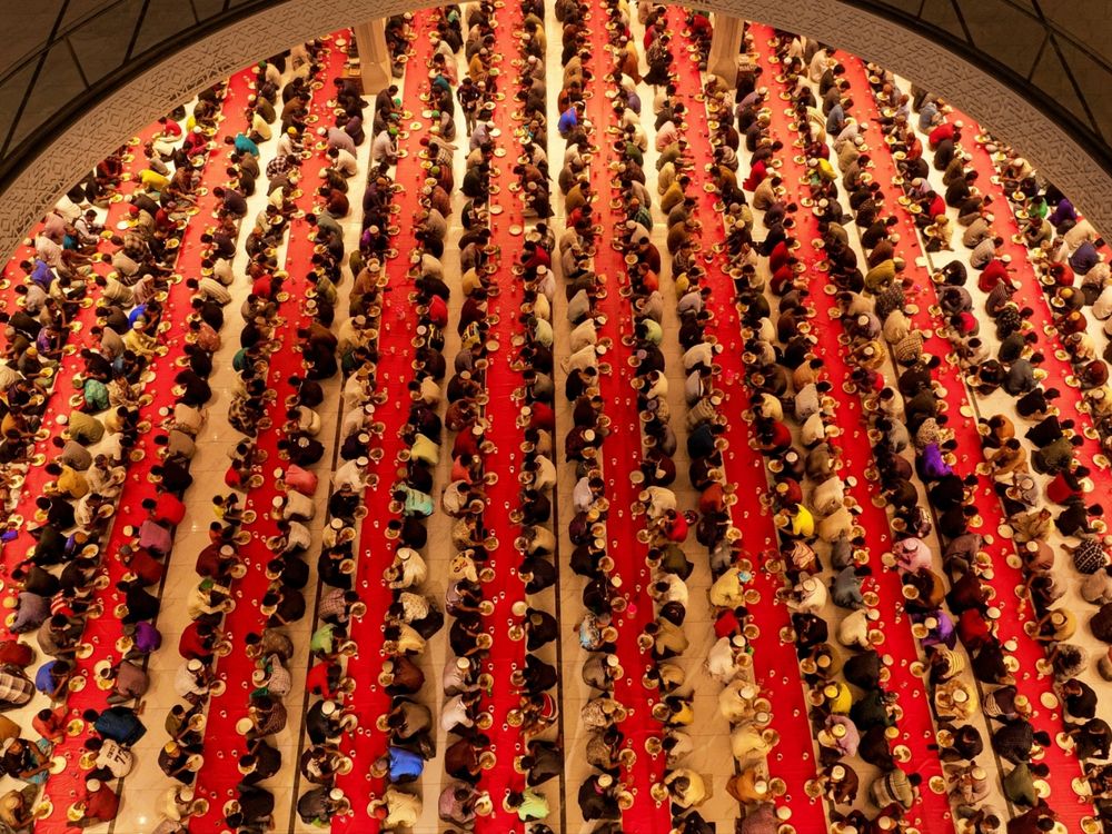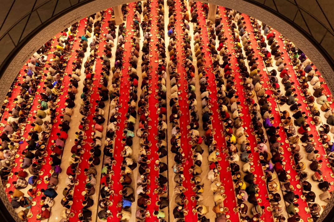 During the blessed month of Ramadan, a large gathering of people comes together for Iftar. The vibrant red tables are filled with grateful faces as they break their fast, sharing the moment of unity, faith, and compassion, reflecting the spirit of togetherness.