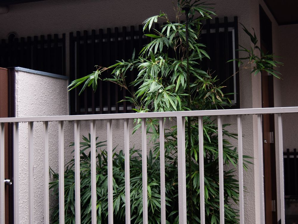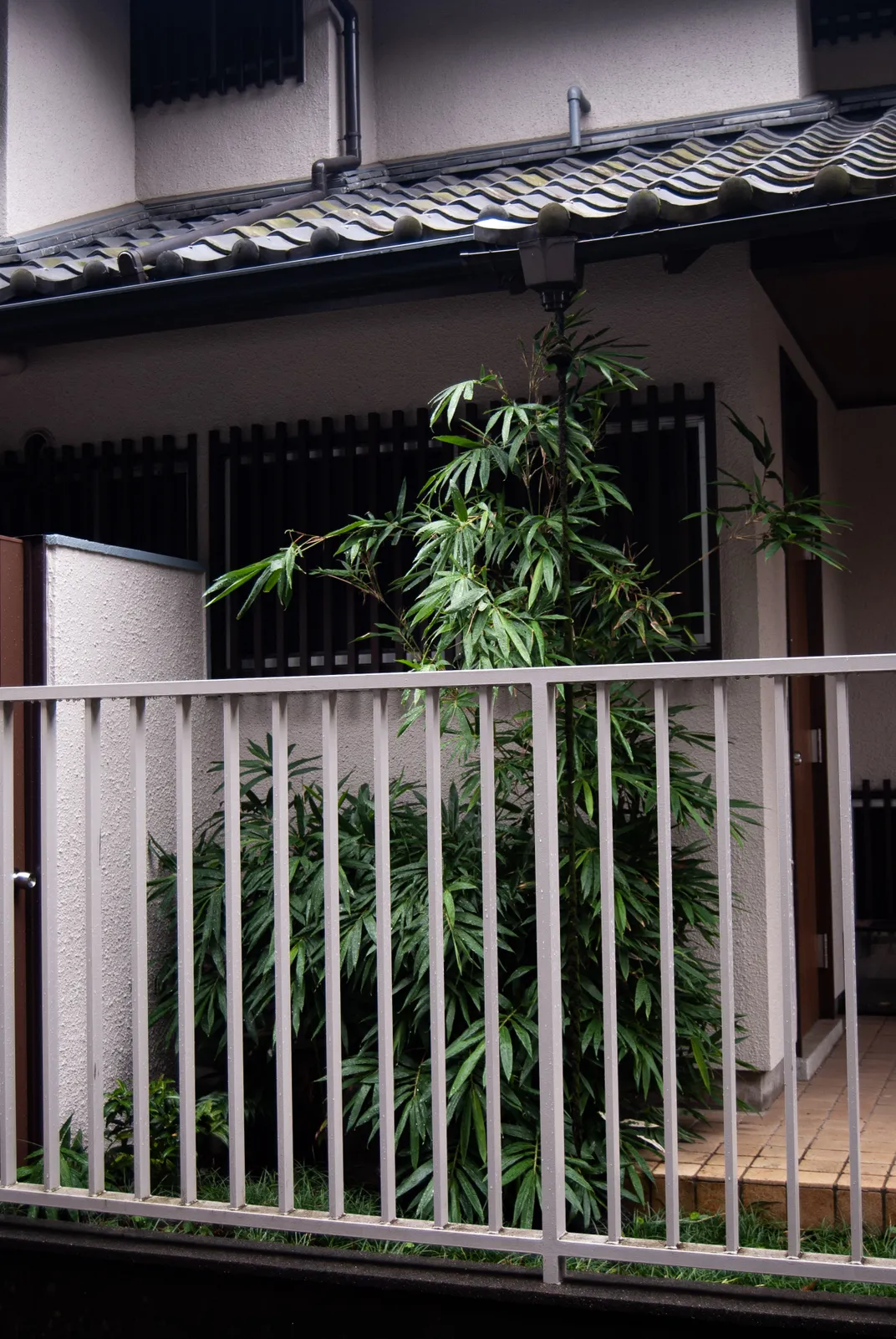 a tall green plant located behind the fence of a suburban house in Tokyo