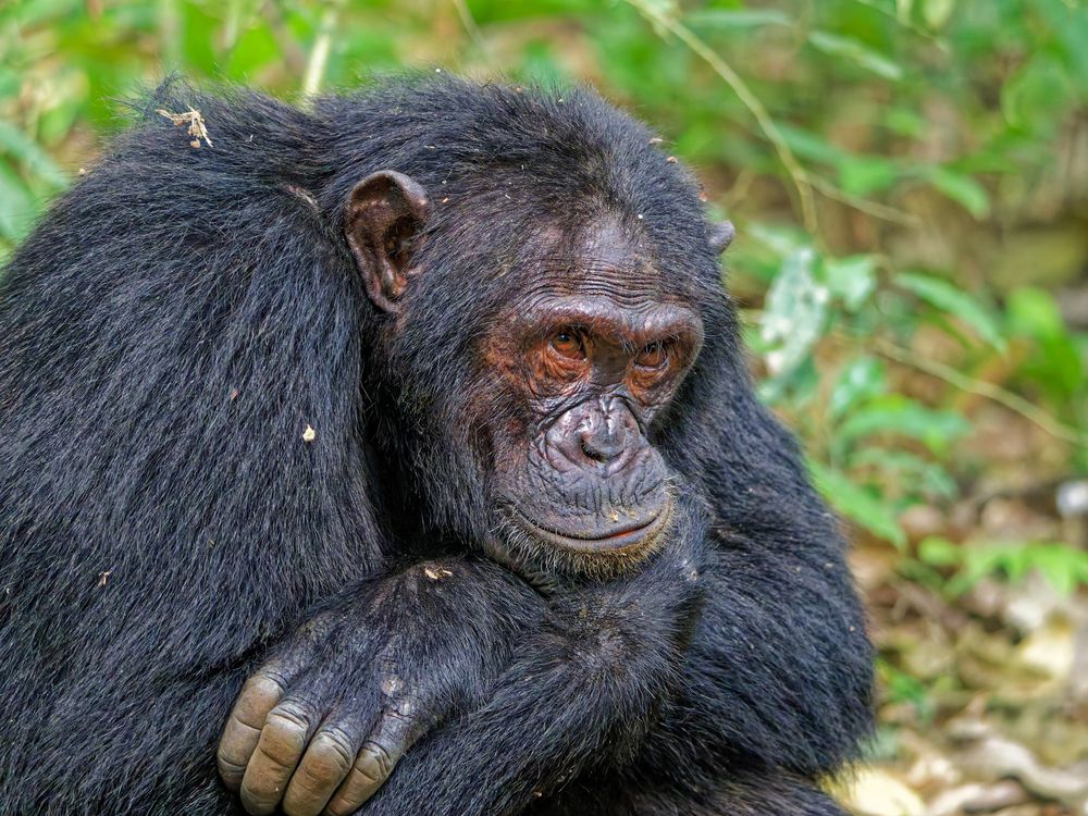 A chimpanzee rests thoughtfully on the forest floor of Kibale in Uganda.