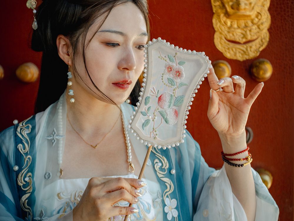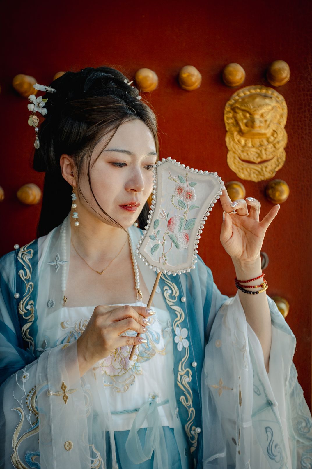 Behind the Vermilion Gate, a whisper of tradition. A poised figure, half-concealed by an embroidered fan, engages in an elegant dance of revelation and mystery. This is not merely a portrait, but a captured moment of cultural dialogue, where the timeless architecture frames a story waiting to be unveiled.