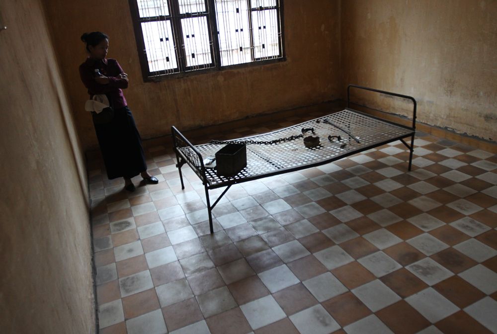 A tour guide at the S21 torture center in Phnom Penh, Cambodia pauses briefly before continuing to explain the atrocities committed by the Khmer Rouge in the late 1970's.