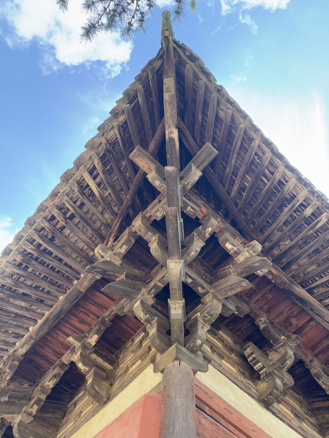 Before our eyes lies a tranquil corner of the ancient Foguang Temple, a millennium-old sanctuary. The massive vermilion columns, slightly inclined inward, stand like weathered yet steadfast guardians, solidly supporting the far-reaching, overhanging eaves. Gazing upward, one sees the intricate and tiered bracket sets (dougong), resembling blossoming wooden lotuses unfurling between the eaves and column tops—serving as both critical load-bearing elements and the most resplendent medals of their era. The eaves themselves form a graceful yet powerful arc, clad in time-worn gray tiles that sweep steadily across the lofty sky. In the shadows of the brackets and beams, the deep umber hues of accumulated years harmonize richly with the vermilion pillars and the mottled tones of the doors. Slanting sunlight casts warm highlights along the wood grain, as if one could almost touch the fragrance of Tang-era timber and the warmth of history. This corner lacks flamboyant paintings or ostentatious carvings. Instead, it embodies the sheer strength and beauty of structure itself—the most direct and awe-inspiring manifestation of the "Tang Dynasty spirit." Silent yet eloquent, it stands as a testament to the brilliance and confidence of Chinese classical architecture at its zenith.