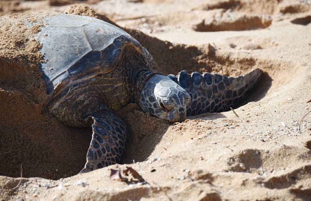 A turtle covers itself with sand while sunning near Alii Beach Park