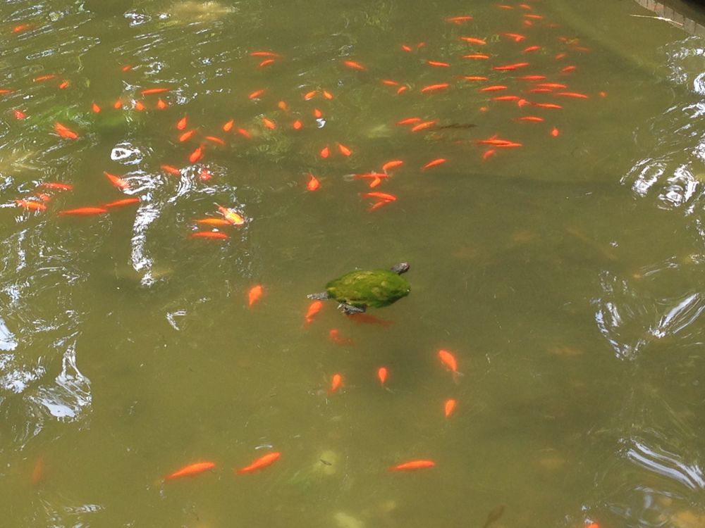 While we were watching the many goldfish swimming in the pond all of a sudden a turtle popped up and decided to join them.