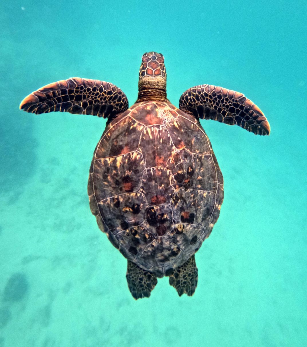A hawksbill sea turtle glides through crystal-clear tropical waters, showcasing the grace of these critically endangered marine reptiles. This moment captures both natural beauty and conservation urgency.