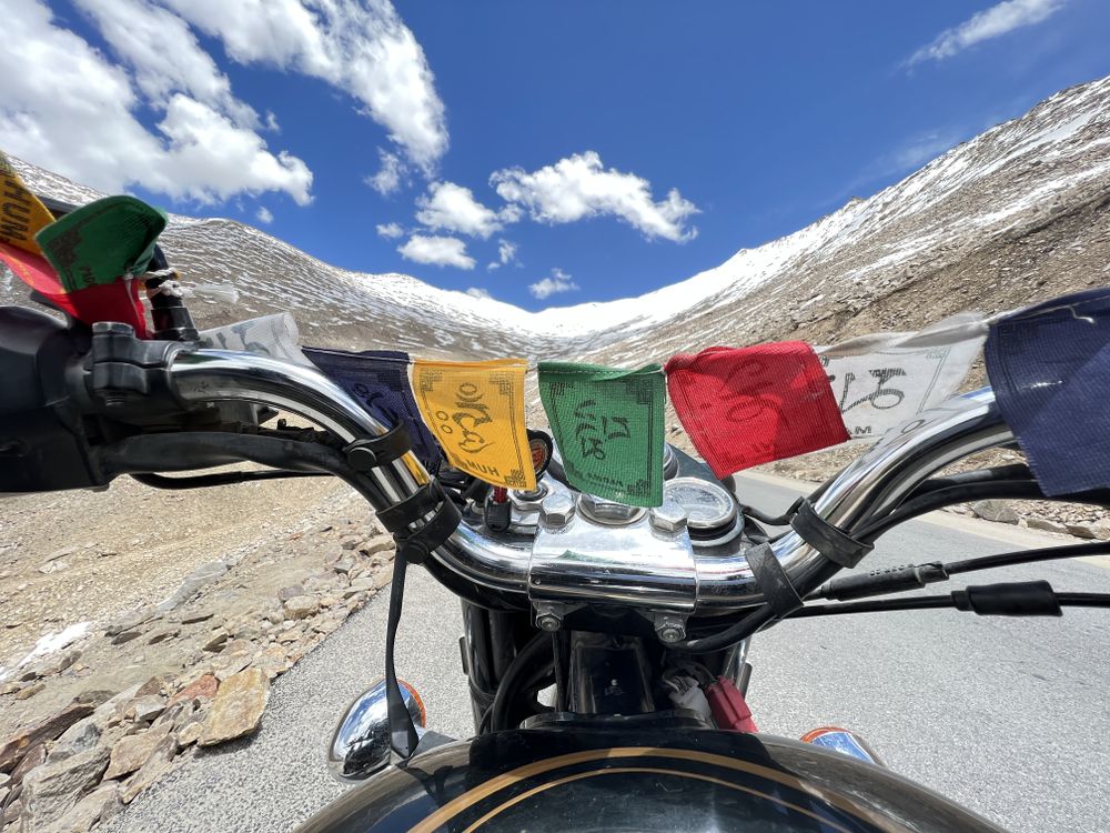 while doing biking at leh Ladakh, i was passing through some of toughest roads over there. on one fine morning when i started my journey & in between road, i found this beautiful angle of photo to click image by my phone putting on fuel tank between steering of my bike while covering whole mountain range & also captured tibetian flags which was fixed on bike steering.