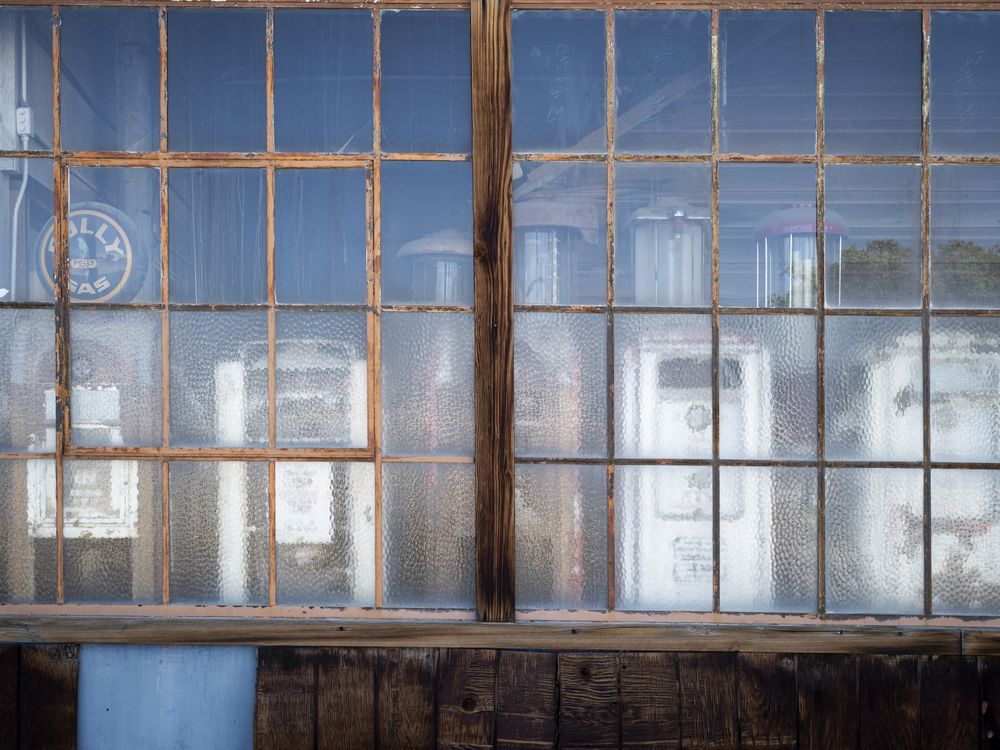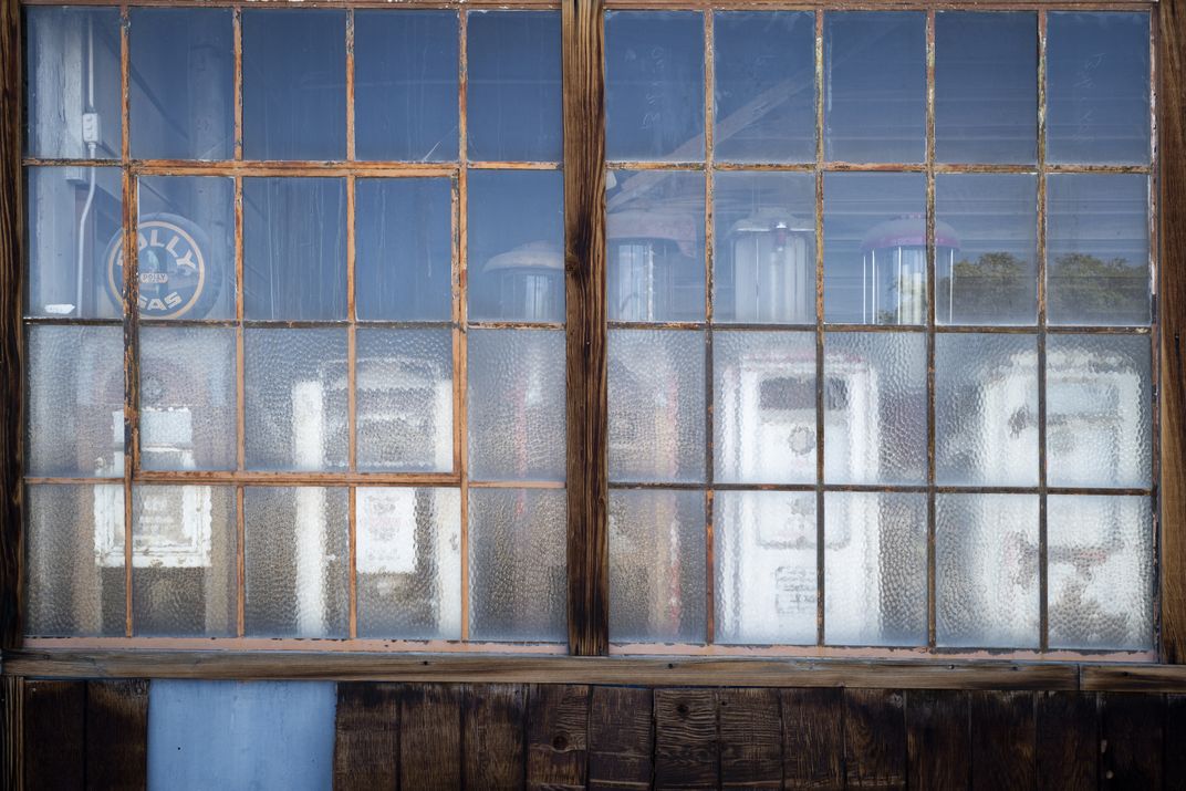 A row of vintage gas pumps looks out from an old service station, part of a large personal collection of automobilia in Fallon, Nevada.