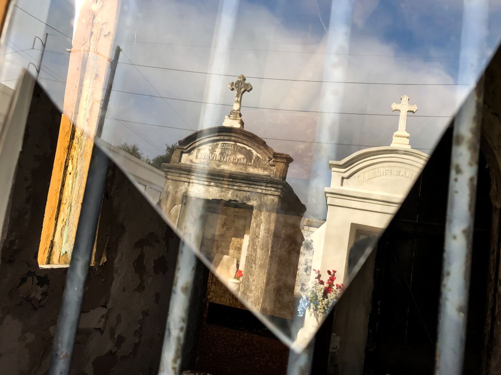A view of crypts at from the broken window of St. Roch Cemetery Chapel
