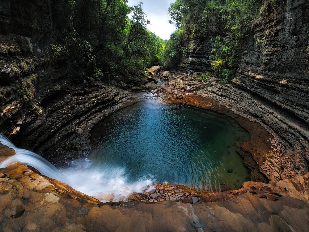 A view of the Wei Sawdong waterfalls captured from a tier above the fall in the state of Meghalaya in India. This three-tiered waterfall cascades through the rocks so beautifully that it is one of the most picturesque falls in India. The view to the waterfall involves some 200mts trekking downhill but upon reaching it is all worth it. The fall welcomes with a sense of serenity, wilderness and the beautiful expanse of nature.