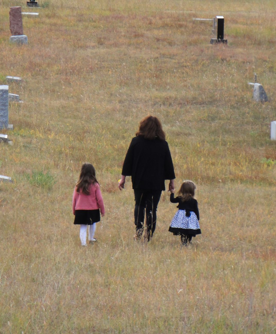 My wife with our two granddaughters strolling through the cemetery after the committal service for my wife's Dad. She was looking to show the girls where other family members were buried.