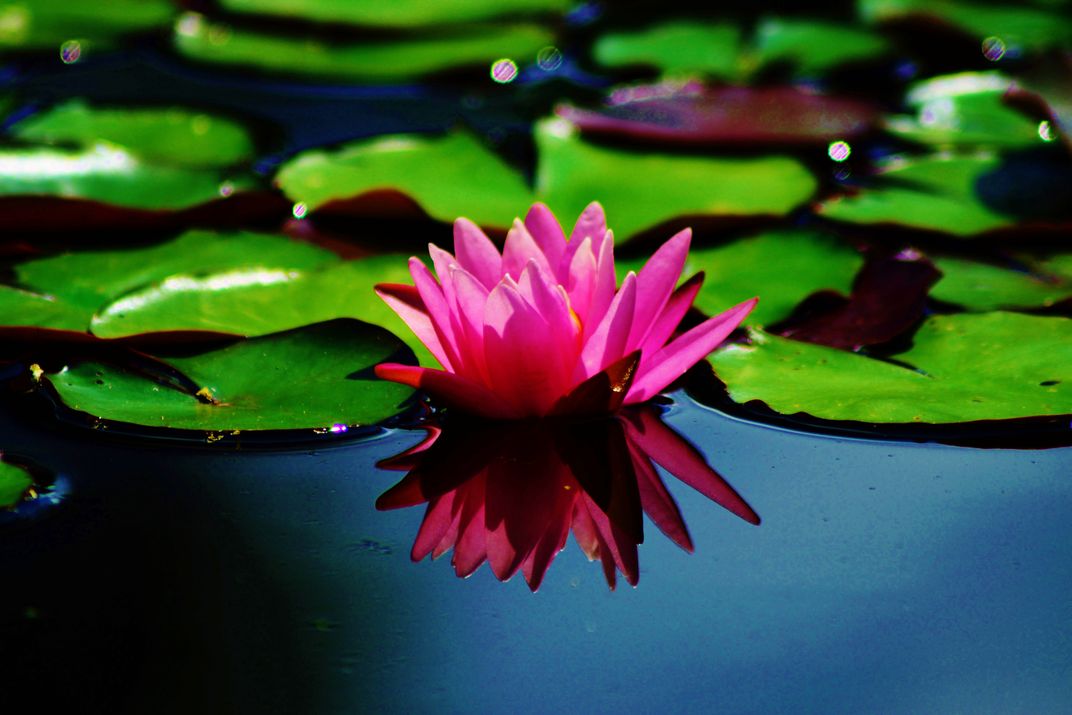 A water lily and its reflection in the water
