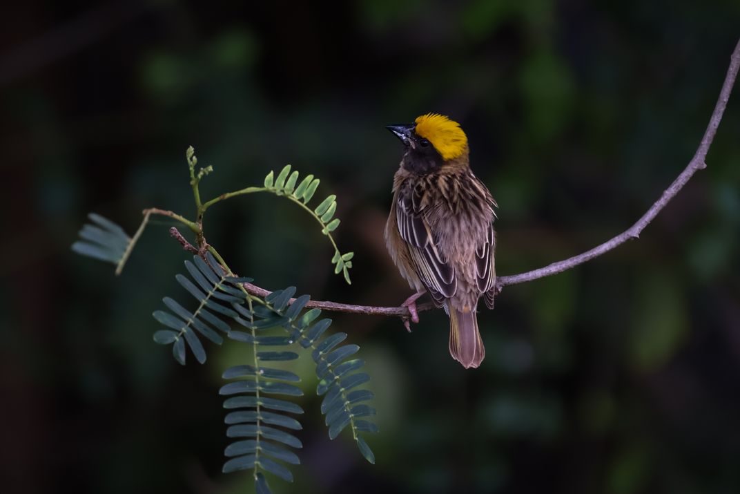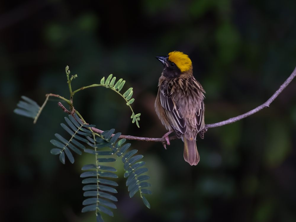 A small weaver with a bright yellow cap sits on a thin branch. It looks alert and calm in the forest shade. This photo captures a peaceful moment in the wild.