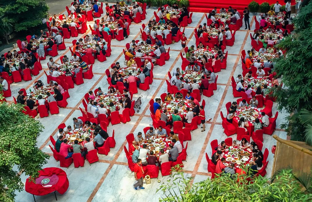 During our visiting in Ying Kou, a city in northern China, we encountered a wedding ceremony in the lobby of the hotel where we stayed. Then they had this banquet at the same area. Tablecloths and chair covers are in all red because red represents happy in Chinese culture.