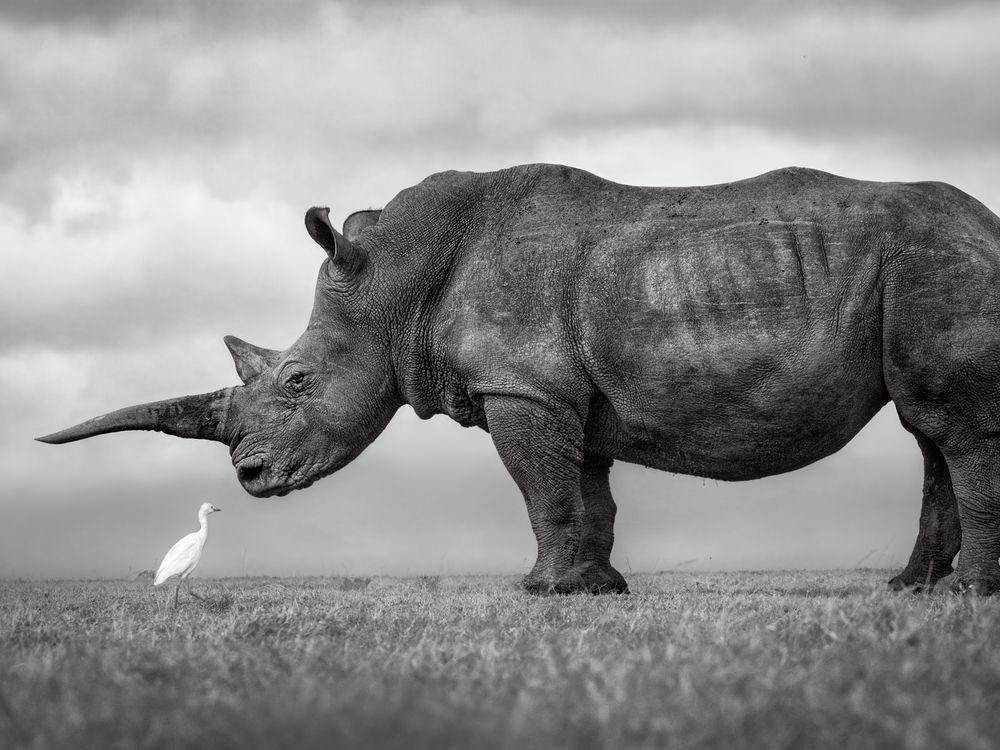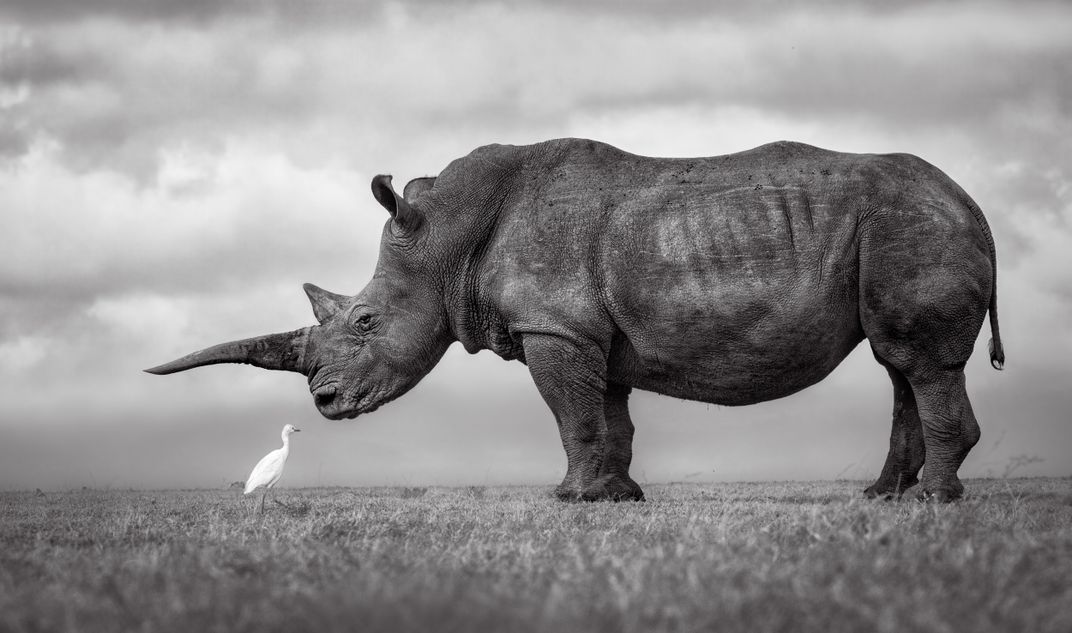 Amid the vast expanse of Solio Game Reserve, a massive rhino lowers its head towards a tiny egret, horn almost touching. In this moment, power and fragility coexist, in silent conversation.