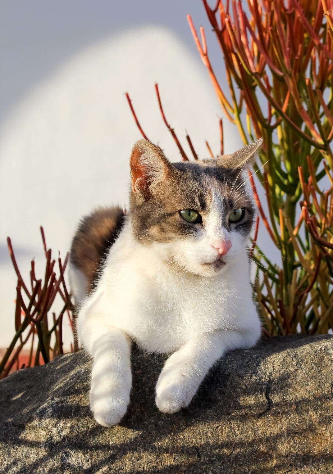 A wild cat sitting on a rock, enjoying a sunny afternoon.