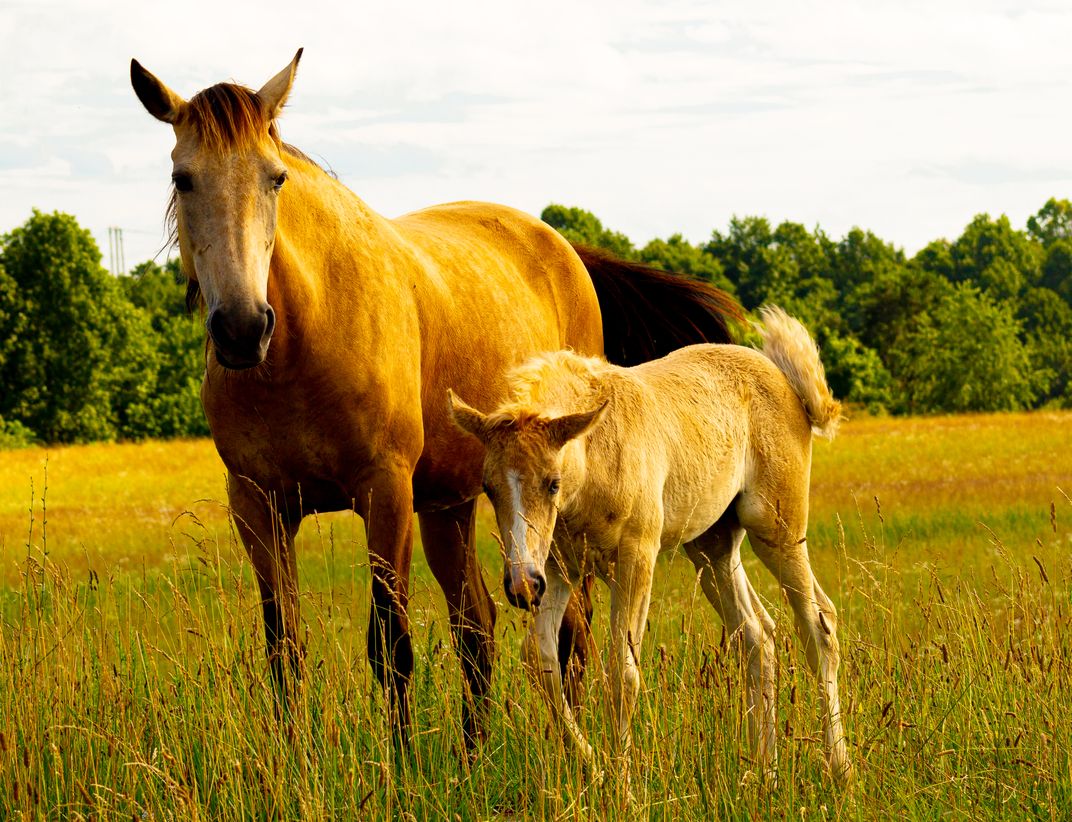 This is an image of an adult horse with a colt that could not have been too old due to it's size.