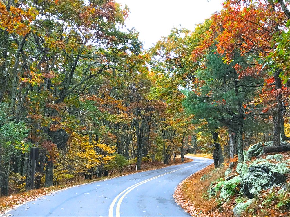 An autumn drive down a winding road of Skyline Drive, Shenandoah National Park