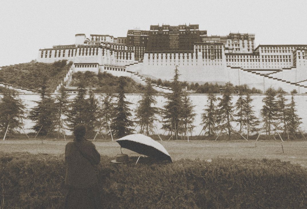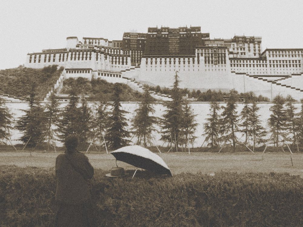 A woman standing in front of the Potala Palace in Tibet