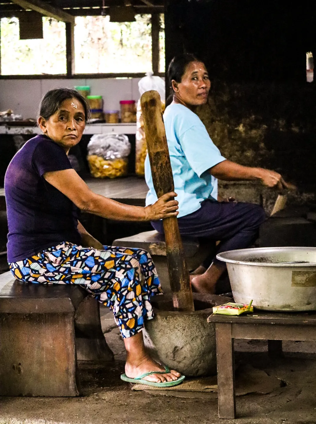 Two women show the process of making Bali coffee from scratch. The crushing, the turning, the burning of the bean. To see 2 women making coffee that is known to bring people energy, seemingly shows them as weary, tired, but full of strength to keep going.