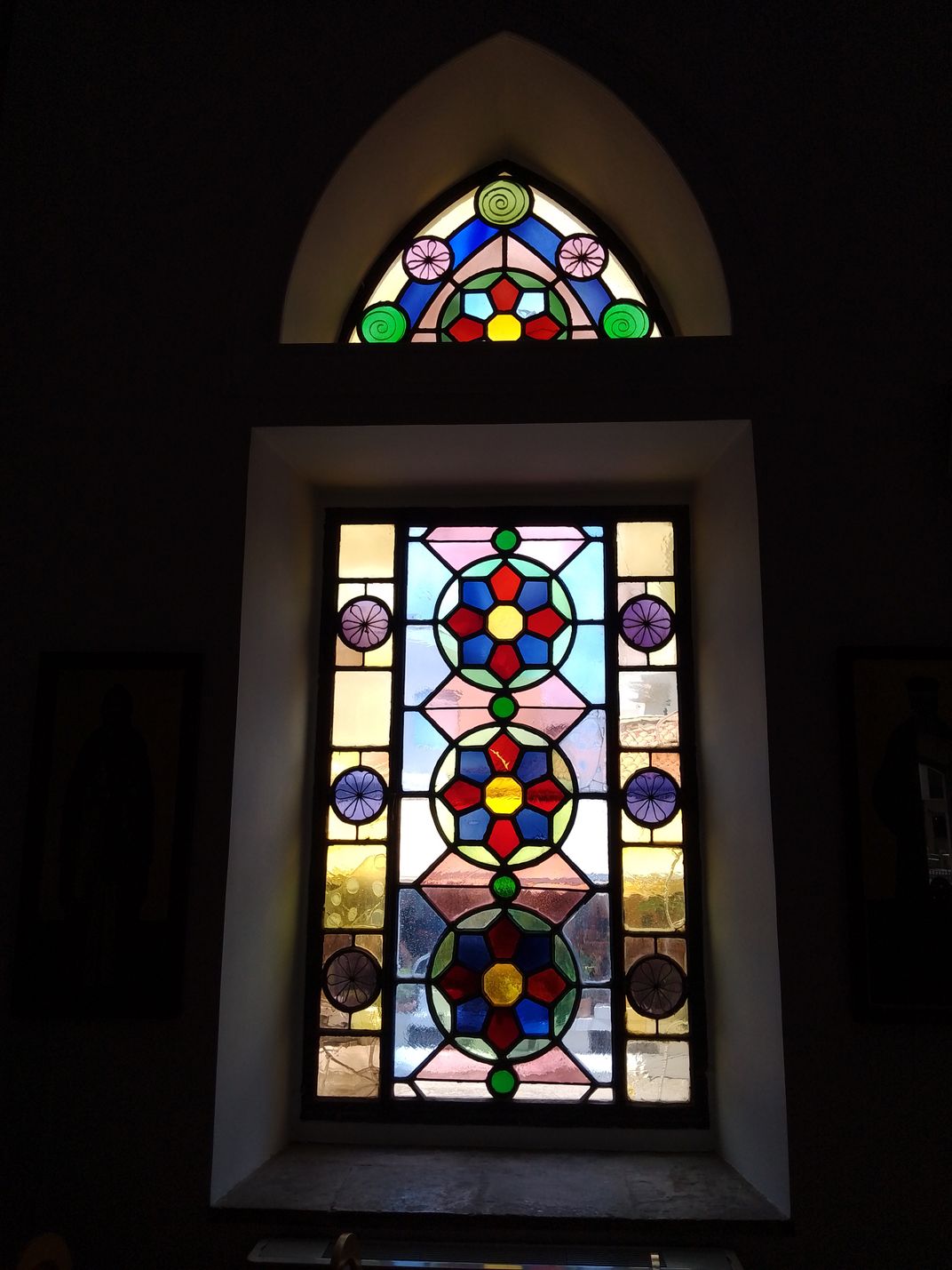 The image presents a stained-glass window in St. Stephen's Bulgarian Orthodox Church in Istanbul.