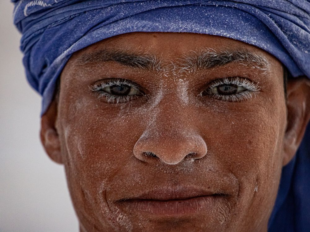 This portrait shows a young limestone worker from the Minya quarries in Upper Egypt — one of the toughest and most dangerous workplaces in the country. Every day, workers spend long hours cutting and shaping limestone under the burning sun, surrounded by clouds of fine white dust that cover their faces, clothes, and lungs. Despite the harsh conditions, the workers continue with steady hands and silent strength. The dust on his eyelashes and skin is not just part of the environment — it is the mark of a life built through endurance, resilience, and the will to provide for his family. This portrait captures the human side of a job that rarely receives attention, revealing both the beauty and the burden carried by those who shape Egypt’s stone by hand.