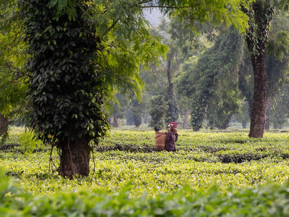 A worker wraps up her day in a tea garden in Assam, India