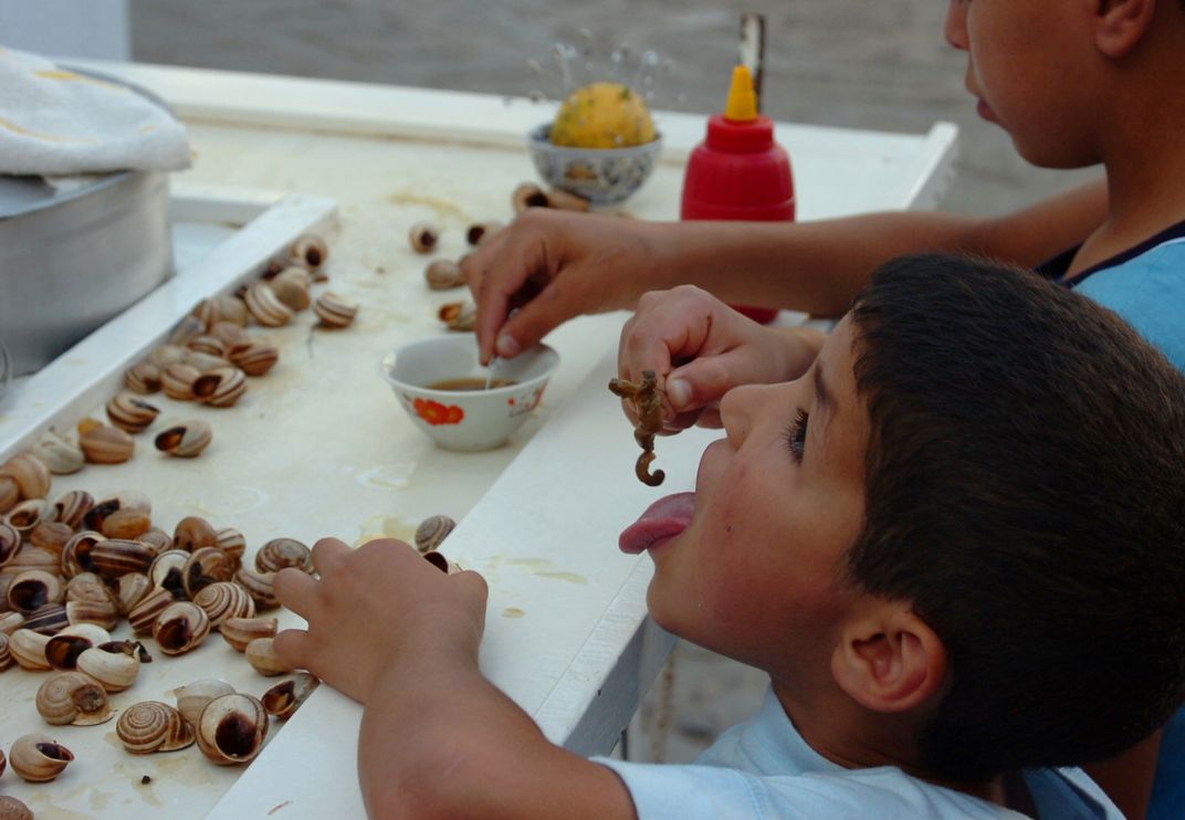 A young boy enjoying snails from a street vendor in medina in Chefchaouen, Morocco.