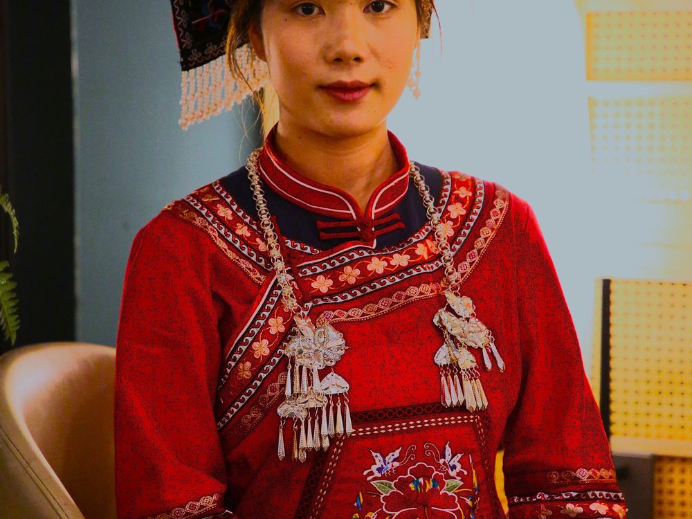 She is a young Buyi ethnic woman. Her headdress and clothing are very typical of a young Buyi woman. She looks beautiful and poised. The Buyi ethnic minority mostly lives in Guizhou Province in southwest China.