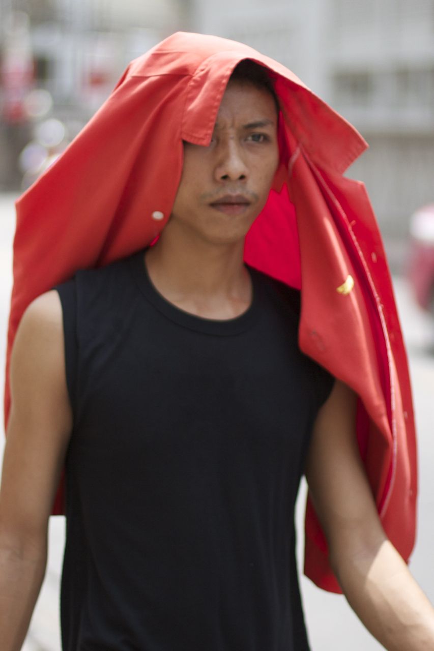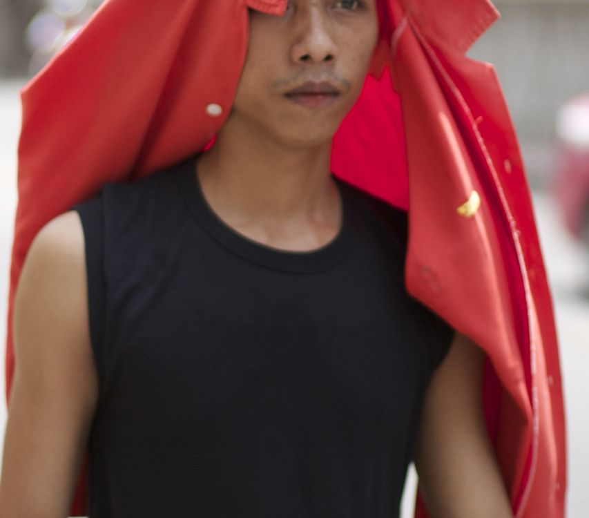 A young man tries to shield himself from Bangkok's relentless April heat.