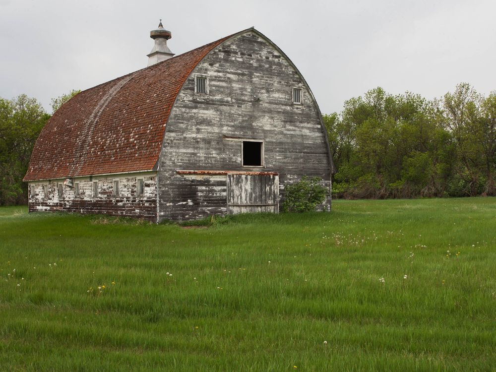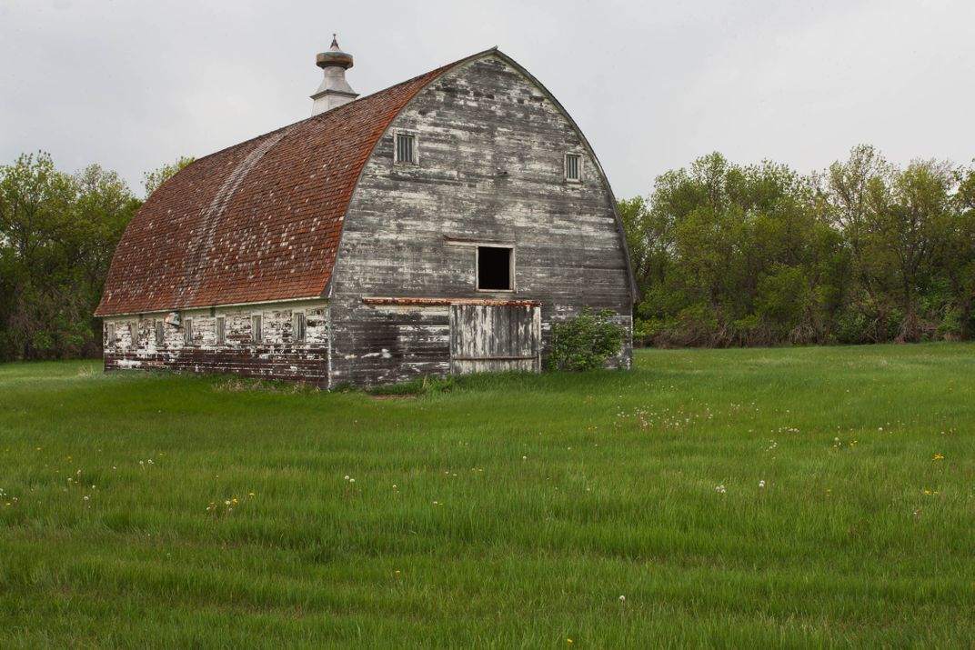 Abandoned barn in North Dakota farmland.