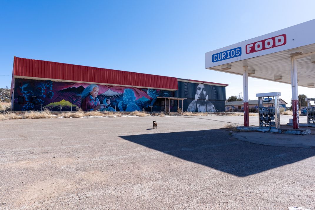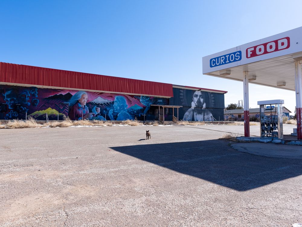 Driving outside of Bluff, Utah in Monument Valley, I came across this great Navajo mural by a local artist (Daniel Josley) behind an abandoned gas station along the highway. I had to stop. It was as if the mural itself, in such an abandoned place, was saying, “Notice me.” It tells a story. March of 2022 was my first time visiting the area. I was impressed by the scale of the red rock monuments all around me but also the vast, dry desert spaces between. I also learned while visiting that Navajo Nation was among the very hardest areas hit by covid during the pandemic, and among the last to lift a mask mandate. Many local area shops and tours were still closed on my visit. I think this capture is powerful and works for a variety of elements all working together: (1) The mural itself, behind, with its vivid color display of Navajo artistry but also challenging times, (2) the gas station roof and sign, with its long shadow, (3) the small dog in the middle, curious to see me standing there, and (4) the colors of America, red, white and blue, very present, reminding us that the Navajo experience in such remote places is very much the American experience, too.