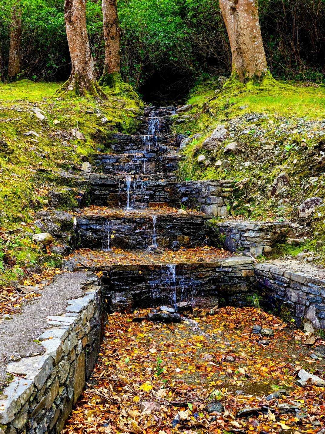 This man-helped waterfall guides the Irish rains down the hill near Kylemore Abby.