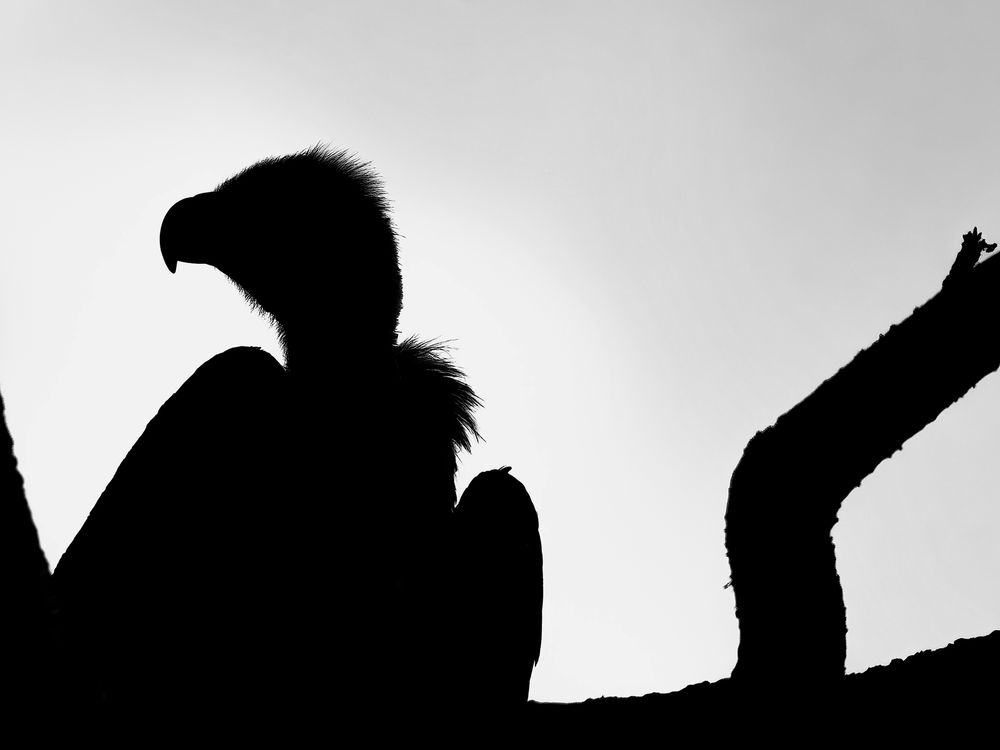In the quiet hours of early morning, when the sun is still rising behind the hills, a lone vulture sits silently on a dead tree. The light behind it glows like a soft halo, turning the bird into a dark, mysterious silhouette.