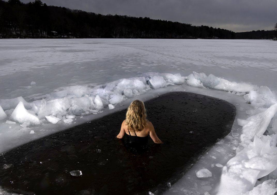 A cold water immersion enthusiast enter a frozen pond after breaking ice