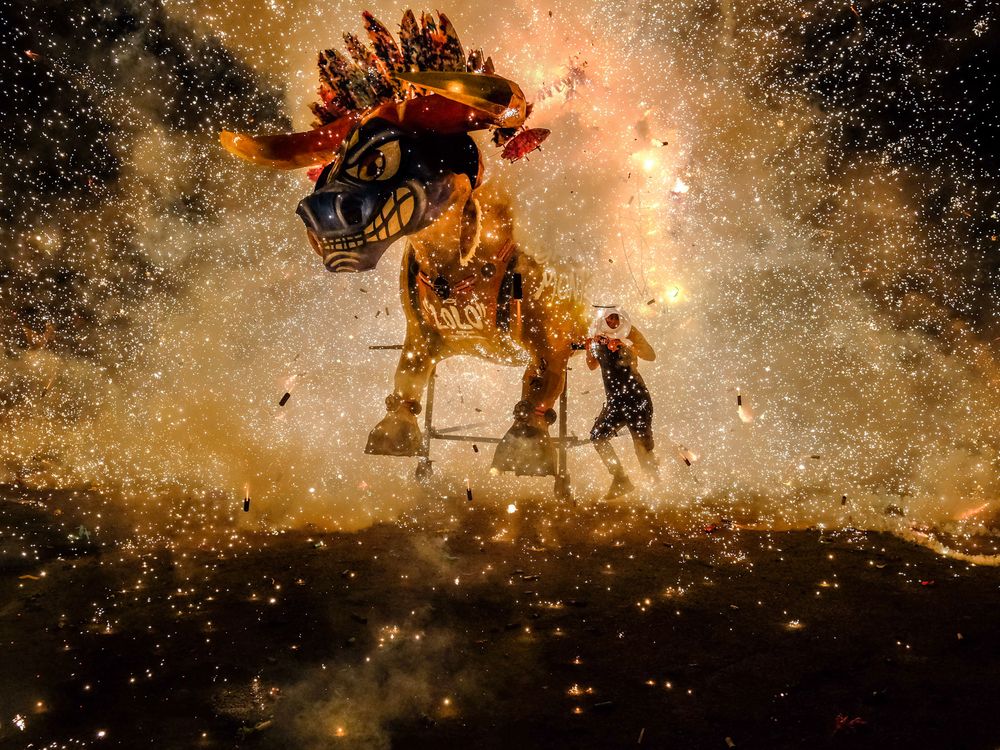 Un joven guerrero del fuego va empujando un monumental toro pirotecnico en la celebración anual de los toros de fuego en Tultepec. El joven va cubriendose solamente el rostro mientras que todo su torso, espalda pecho y estómago reciben una peligrosa y poderosa descarga de millares de chispas y pequeños proyectiles que emanan de la colosal y furiosa bestia. Esta actividad es parte del ritual en el que los jóvenes se prueban y retan al fuego frente a frente para convertirse en hombres. Esta es una de las tradiciones más peligrosas e importantes en el pueblo de Tultepec la cuna de guerreros y maestros de la pirotecnia el hogar de los señores herederos del fuego