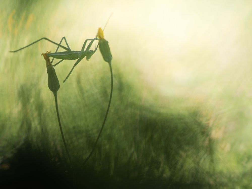 A Saga hellenica nymph balancing on two flower buds. This insect can grow to an impressive size and it's amazing to see how nimble it can be.