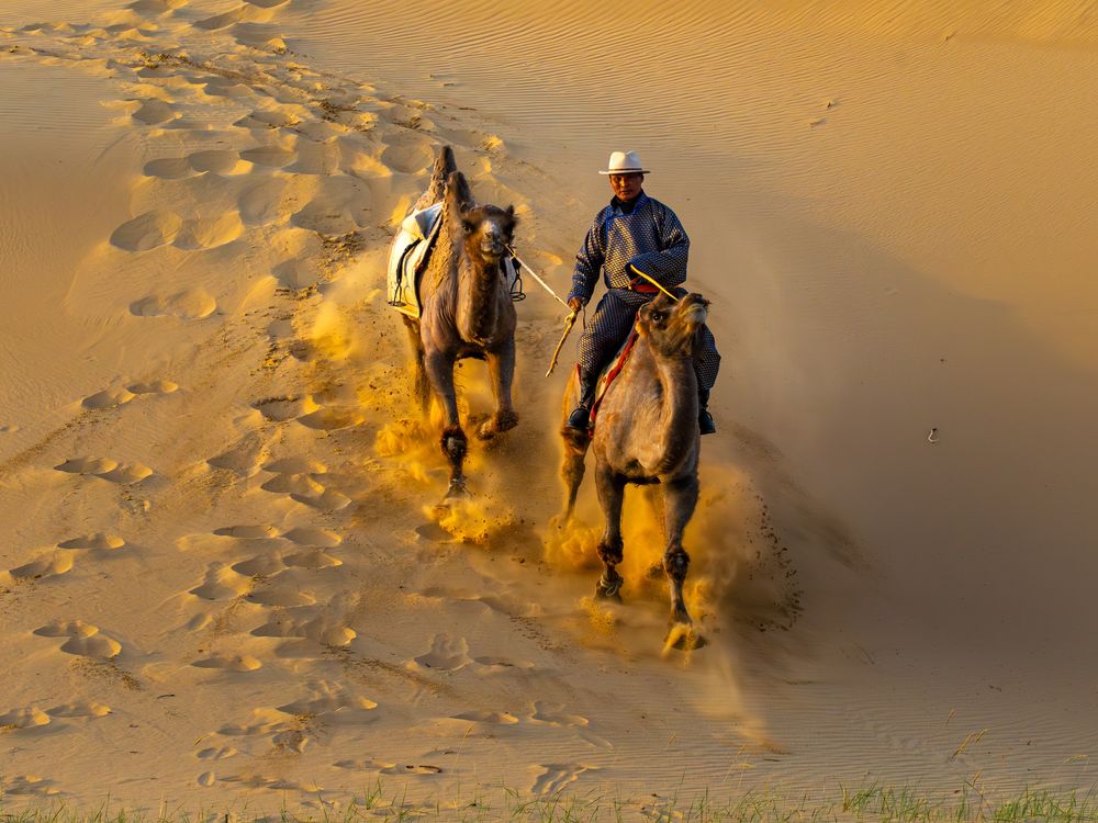 A herder rides between two camels through the shifting sands of the Little Gobi. The golden light of dawn turns each step into a cloud of dust — motion against stillness.