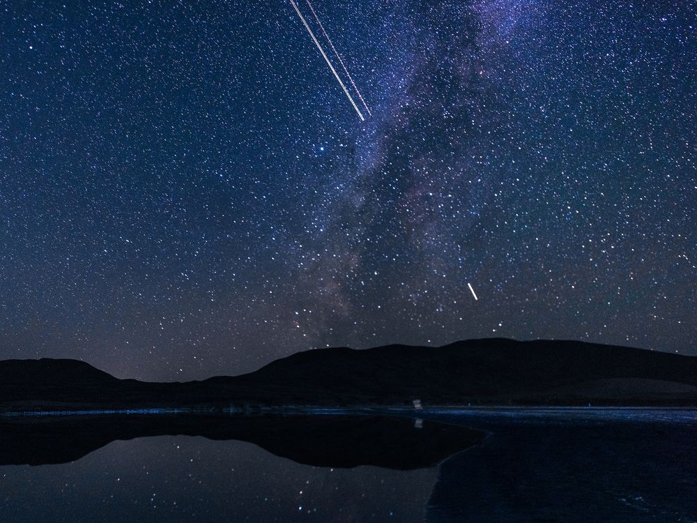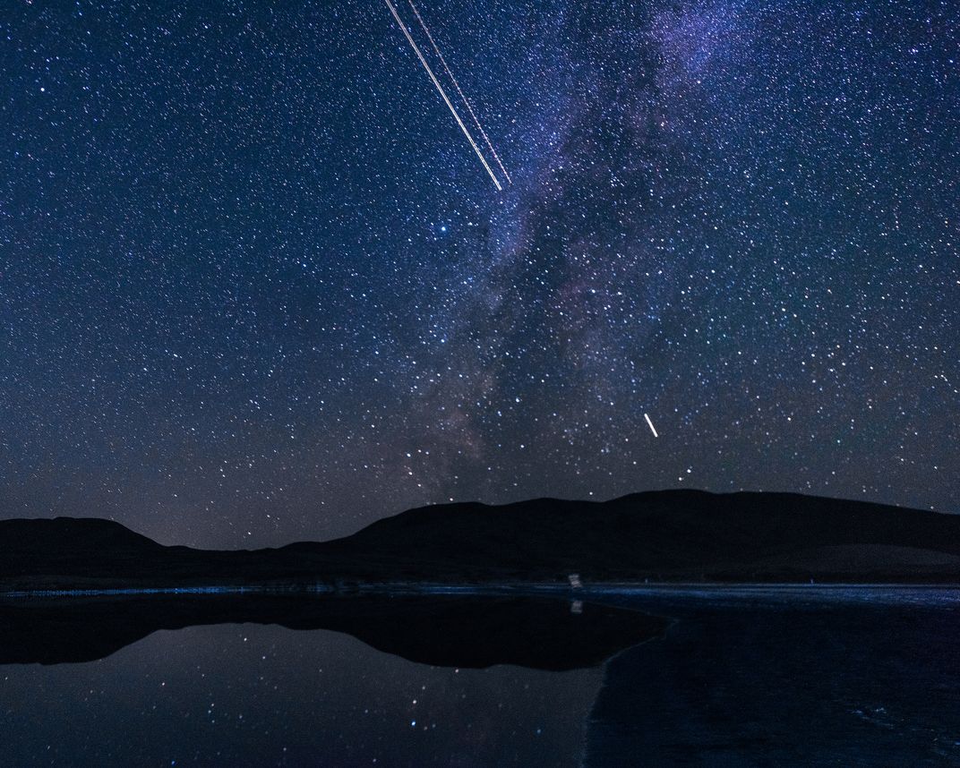 In the deep desert night, the lake is like a quiet mirror, reflecting the brilliance of the Milky Way and the stars. Suddenly, the two planes crossed the Milky Way at a rapid speed, leaving behind two bright or dark lines, like meteors streaking across the night sky, brief and shocking. Taken on October 20, 2023 in the Badain Jaran Desert in Inner Mongolia, China.