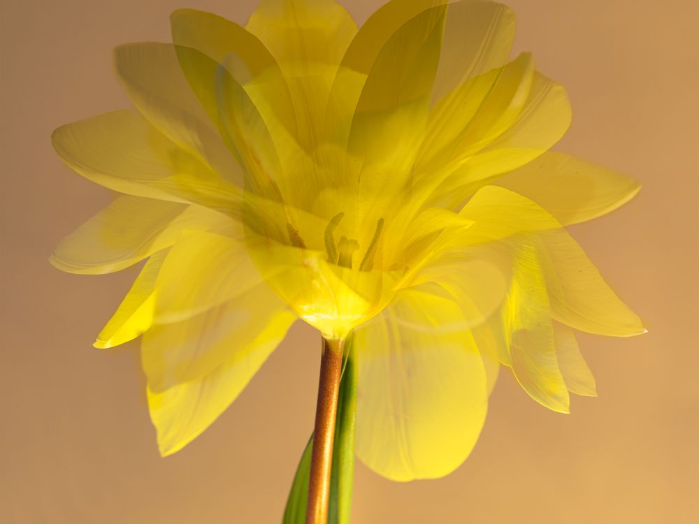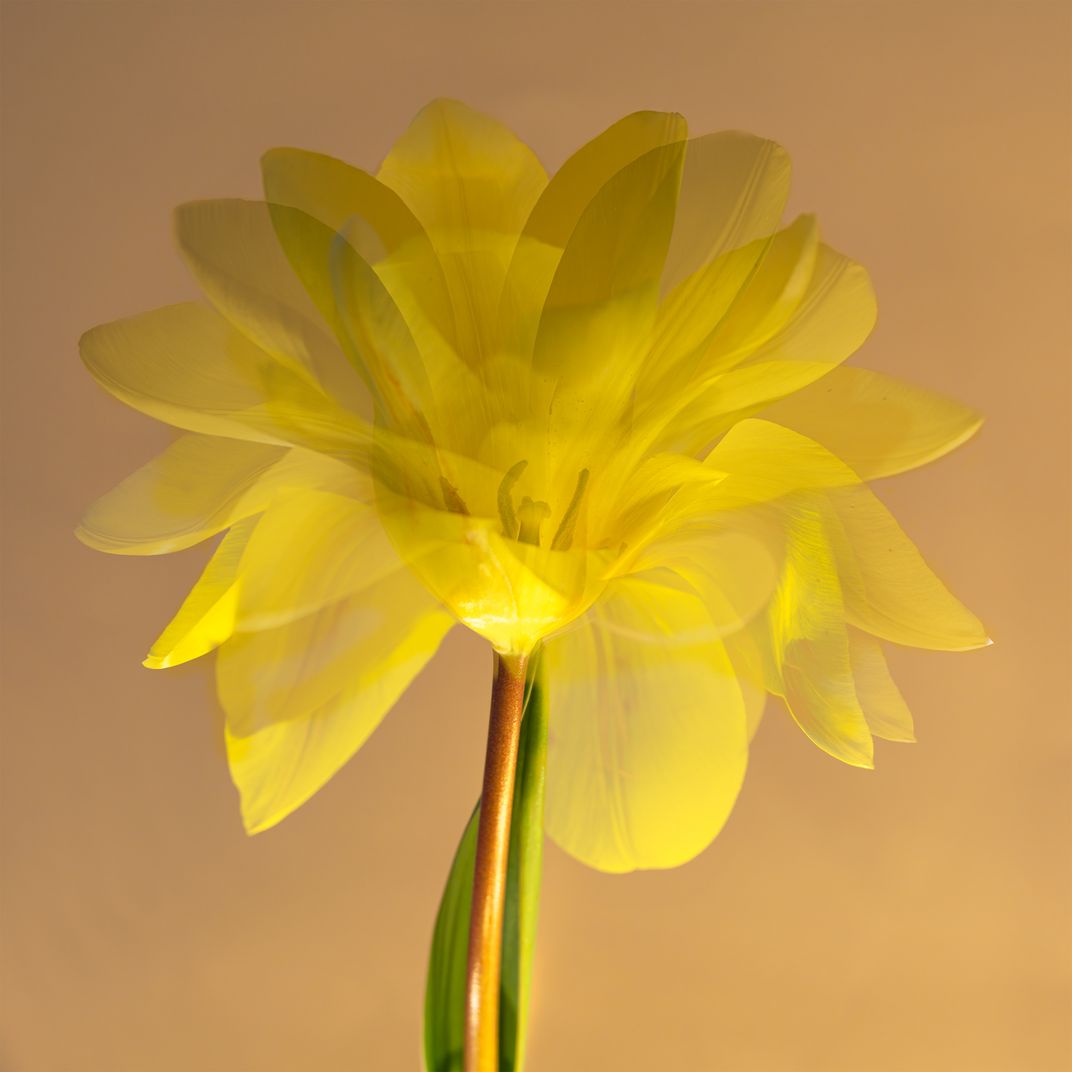 In a typical daytime setting, tulips open their petals in response to heat and light, attracting pollinators. At night or on rainy days, as temperatures drop and light dims, tulips gradually close their petals, conserving energy and protecting their reproductive structures, a natural rhythm known as nyctinasty. For this image, I took a series of photos of the tulip as it was closing its petals in the dark, then layered the photos to give the final composite.