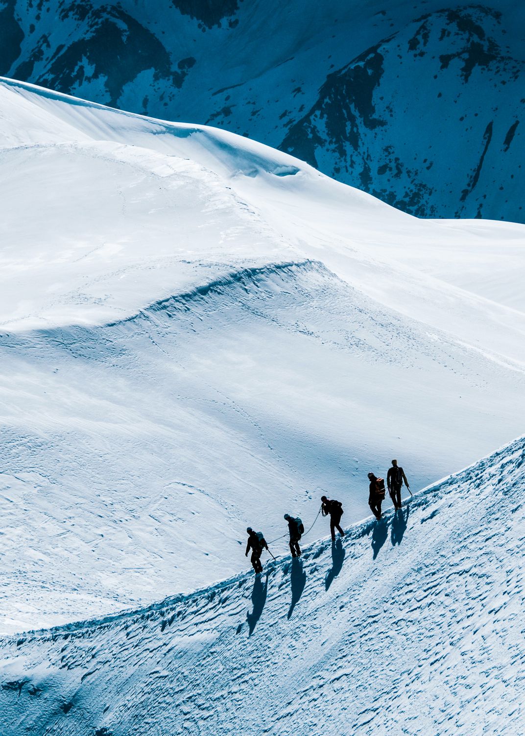 We rode the gondola to the top of the Aiguille du Midi in Chamonix, France. This lift took us to 12,600 ft atop the Alps. Many climbers and skiers were on the lift as well. They descended this snow ridge to continue their adventures.