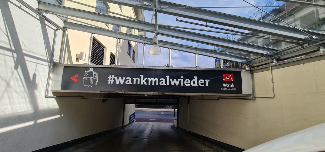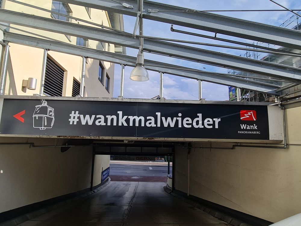 It says in German WANK AGAIN. Advertsing the WANK mountain railway in Garmisch Germany.