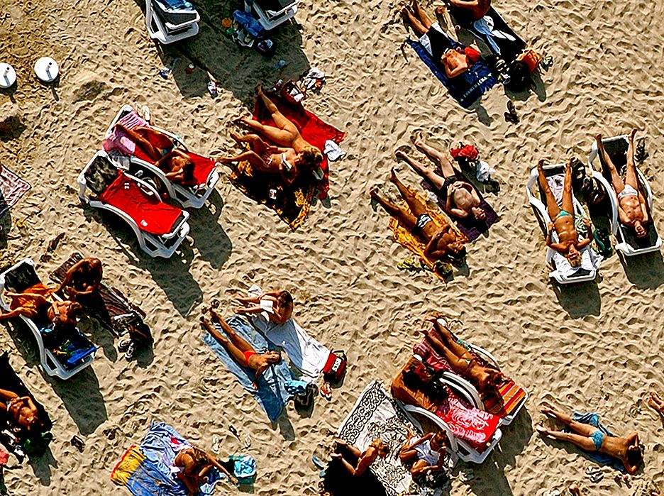 Aerial view of people sunbathing on topless beach in Ibiza Spain.