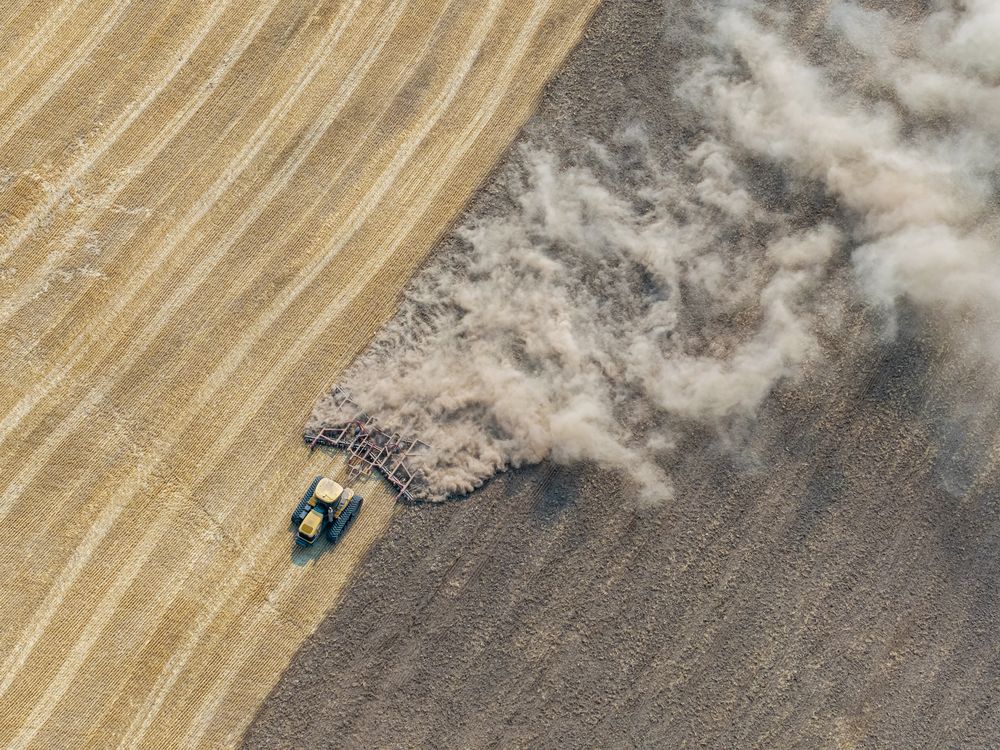 A tractor carves through the soil, transforming farmland into neatly furrowed rows.
